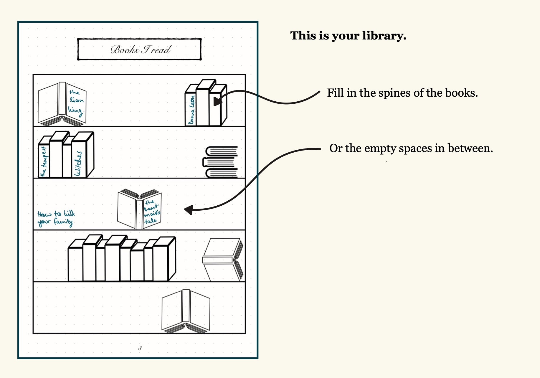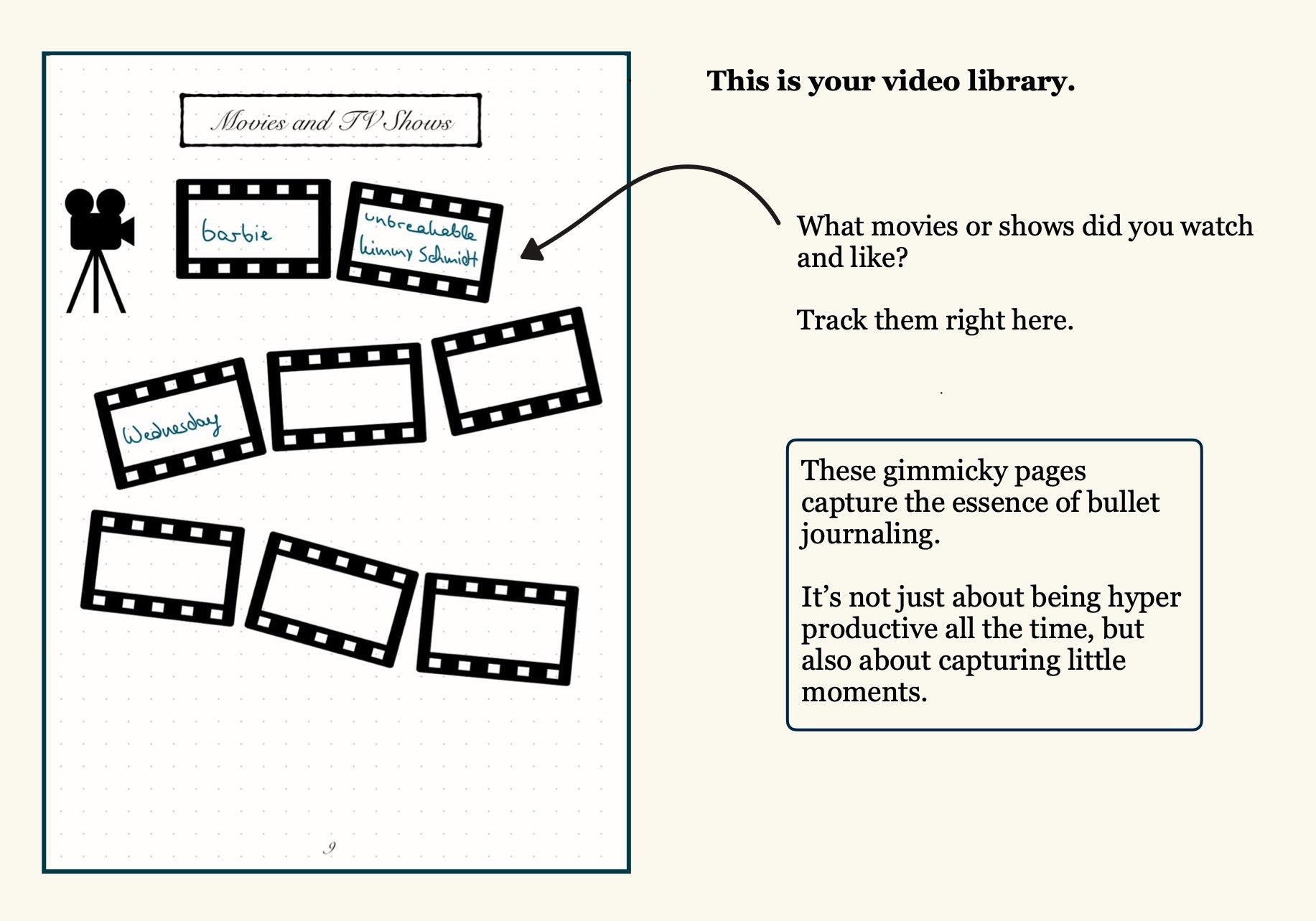 - personal spreads to keep track of favorite movies, shows, books, and songs