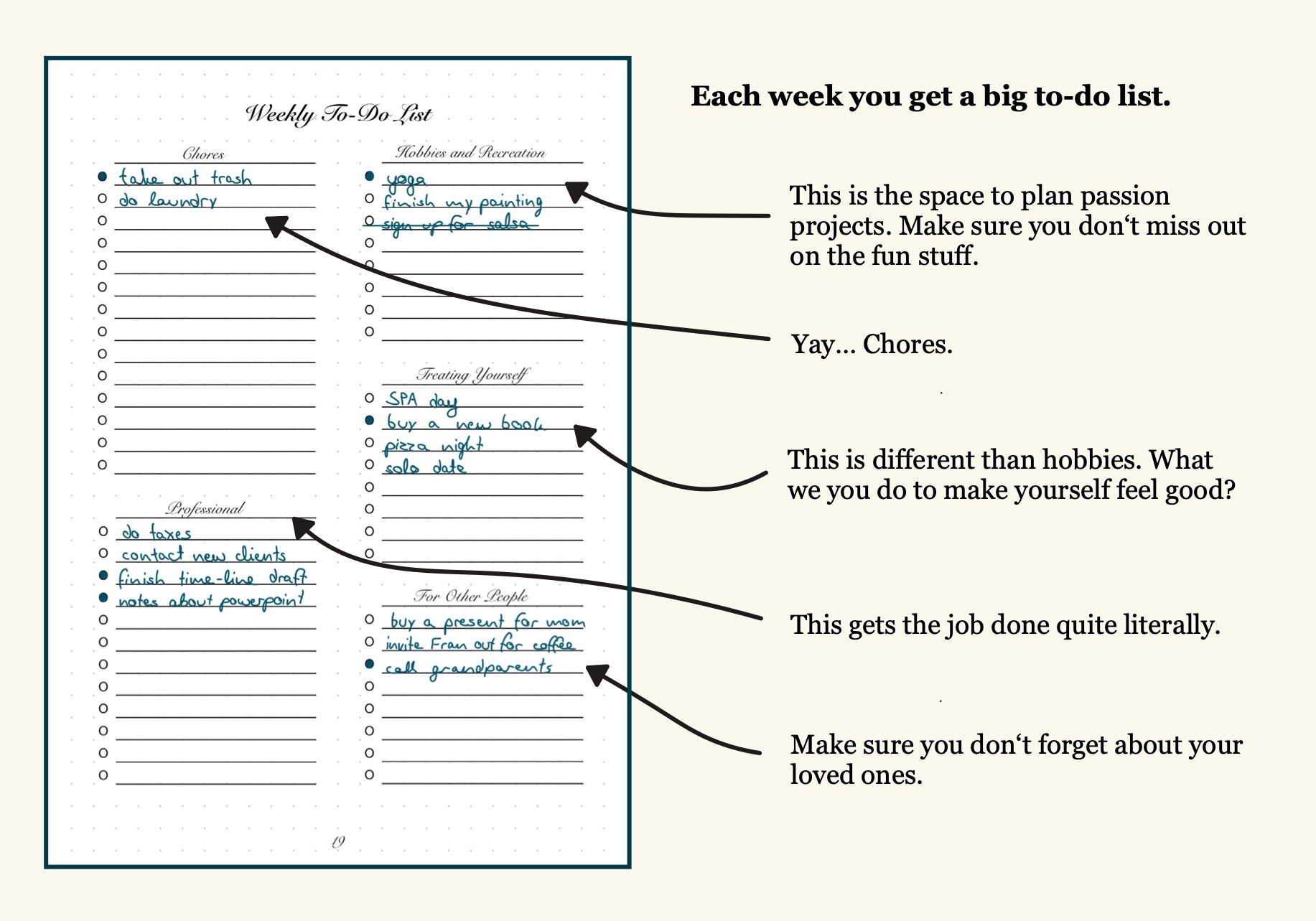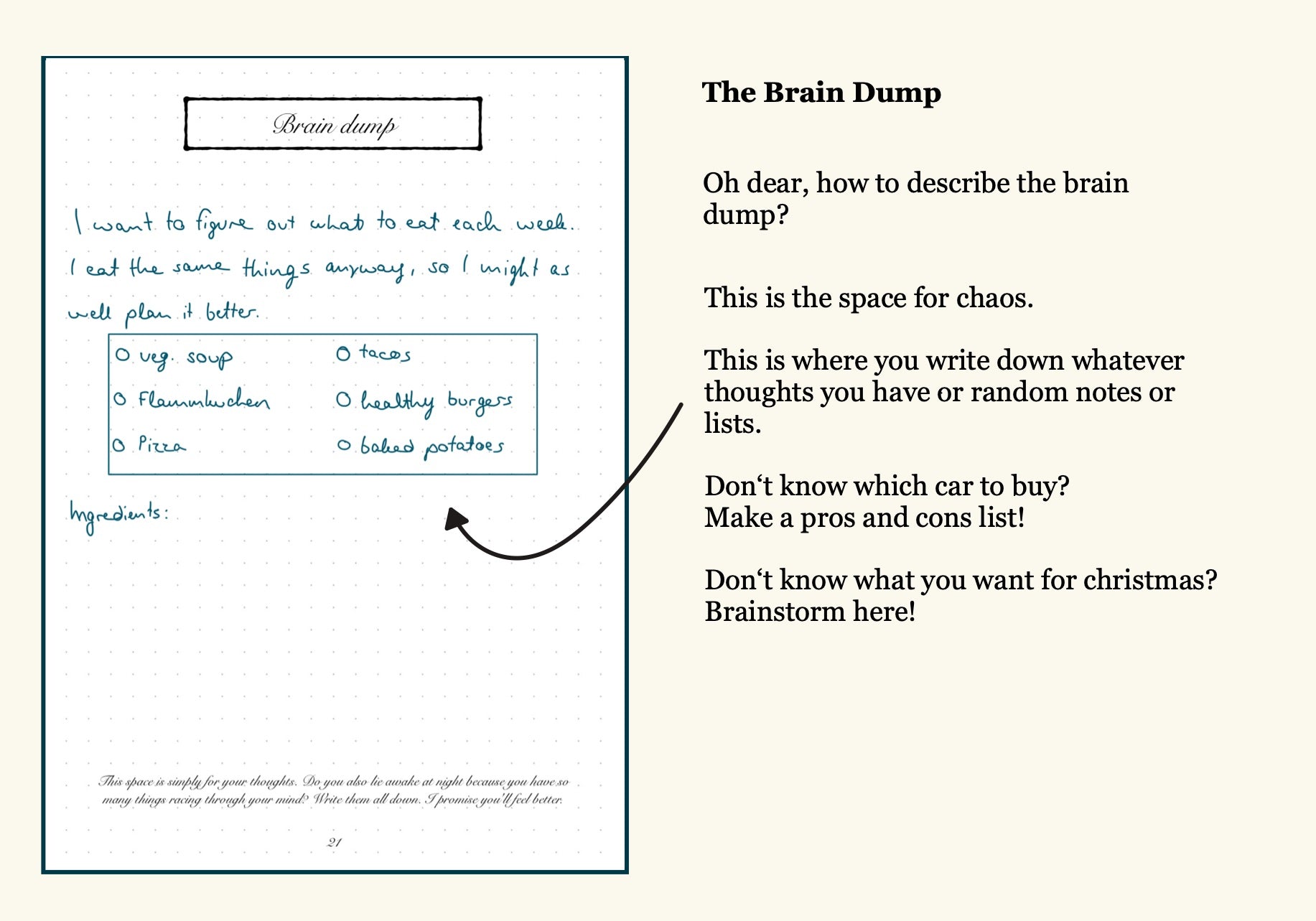 - weekly spreads with to-do lists, brain dumps, and reflection pages